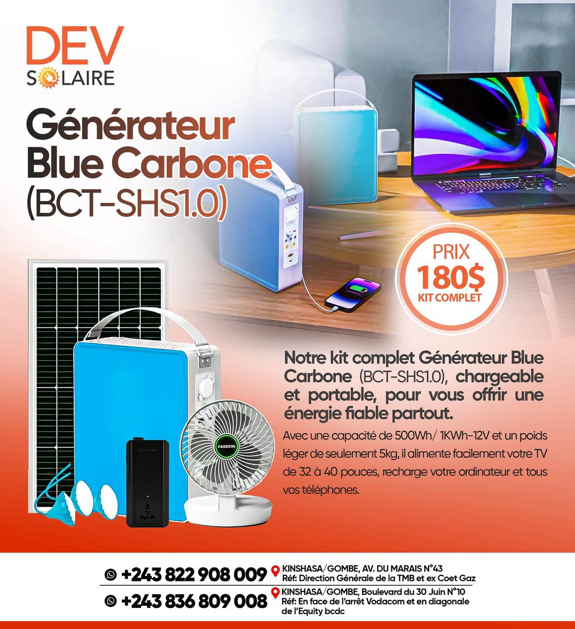 Le générateur solaire Blue Carbon BCT-SHS 1.0 est une solution d’énergie pratique et fiable pour les maisons et les zones où l’électricité est instable. Conçu pour fonctionner avec l’énergie solaire, ce système permet d’alimenter différents appareils essentiels comme l’éclairage, les ventilateurs ou les petits équipements électroniques. Compact et facile à installer, il constitue une alternative économique pour réduire la dépendance au réseau électrique. Grâce à sa technologie performante, le générateur Blue Carbon offre une alimentation stable et durable. C’est une solution idéale pour les foyers, les commerces ou les zones rurales souhaitant profiter d’une énergie propre et renouvelable.